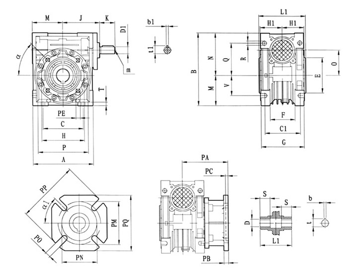 型號 Q R S T V PE b b1 t t1 m α Kg.