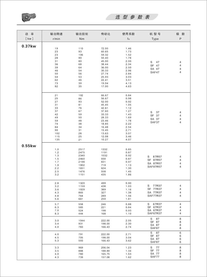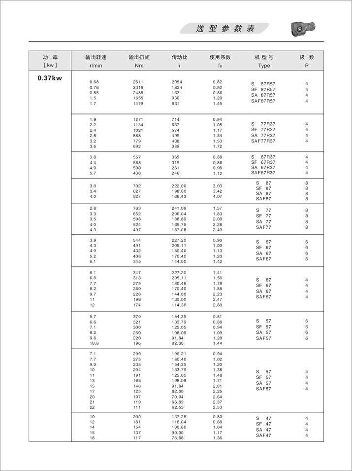 S系列斜齒輪蝸桿減速機選型參數表0.37KW