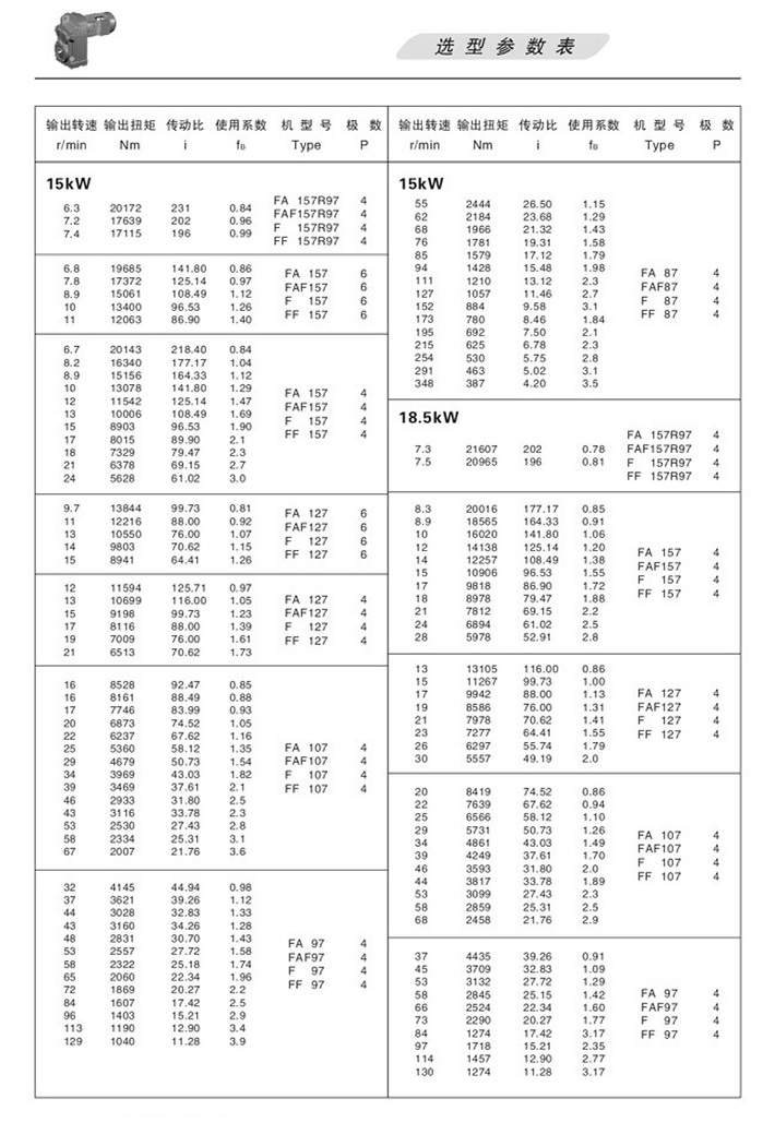 F平行軸斜齒輪減速機選型參數表15KW、18.5KW、22KW、30KW