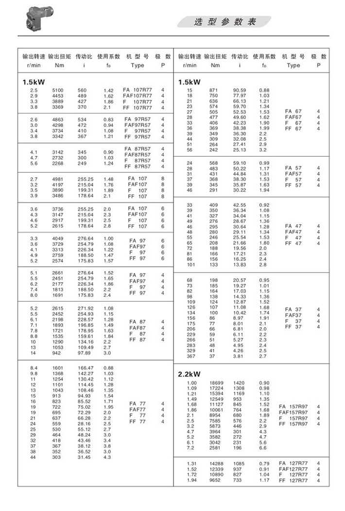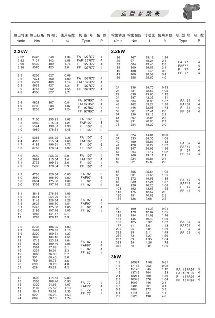 F平行軸斜齒輪減速機選型參數表2.2KW
