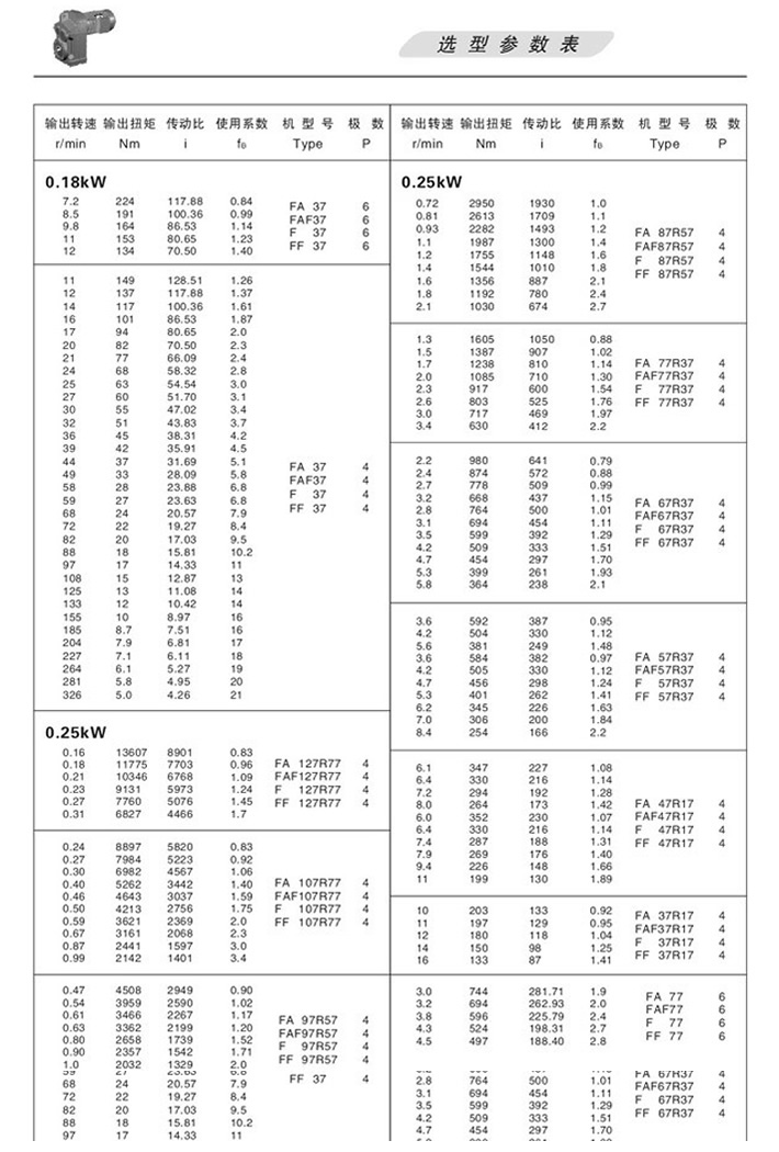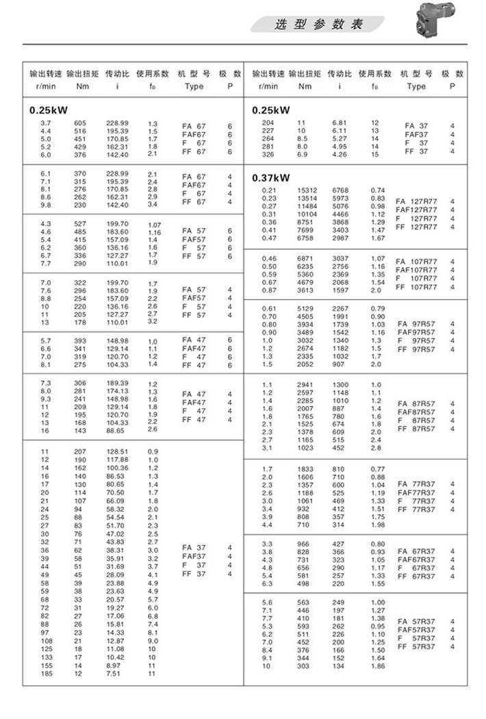 F平行軸斜齒輪減速機選型參數表0.25KW