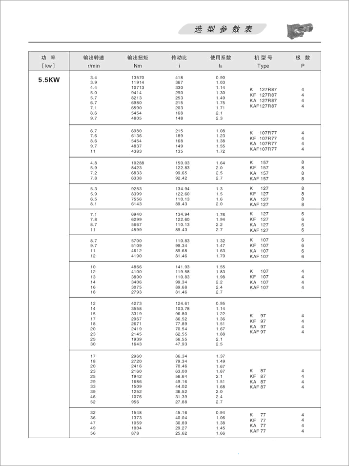 K螺旋錐齒輪減速機選項參數表5.5KW