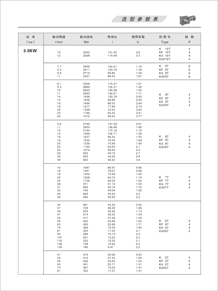 K螺旋錐齒輪減速機選項參數表3.0KW