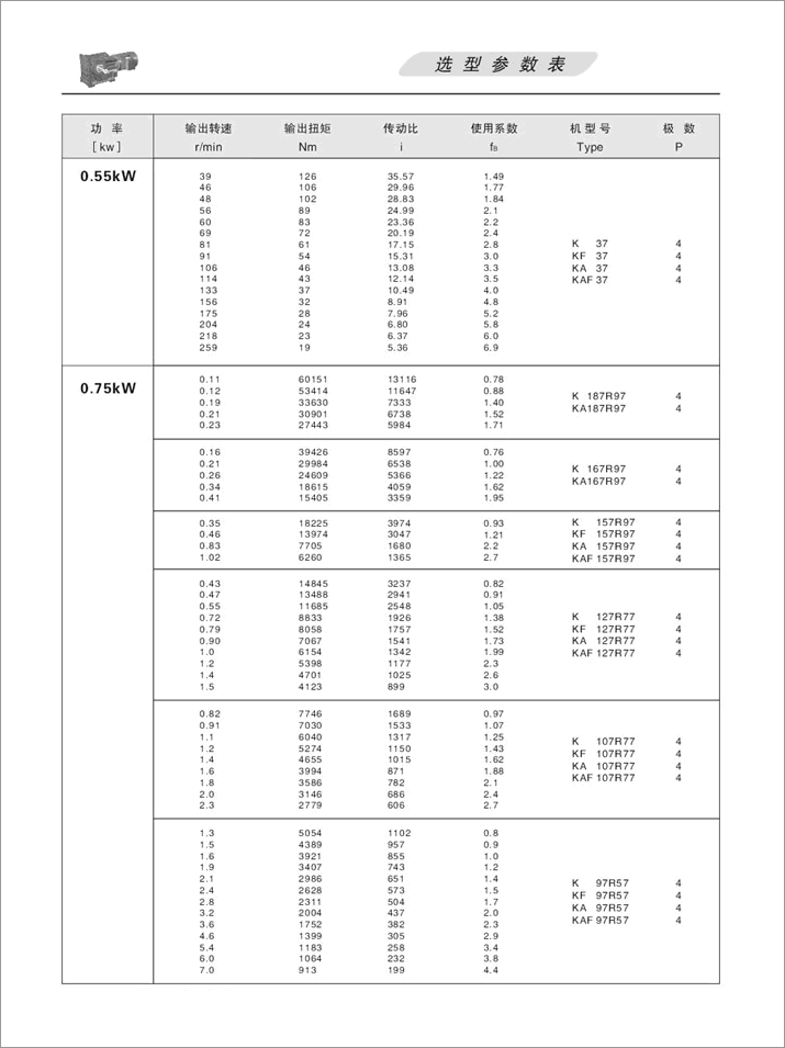 K螺旋錐齒輪減速機選項參數(shù)表0.75KW