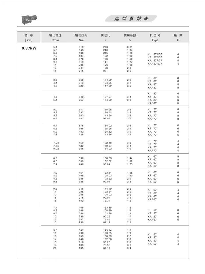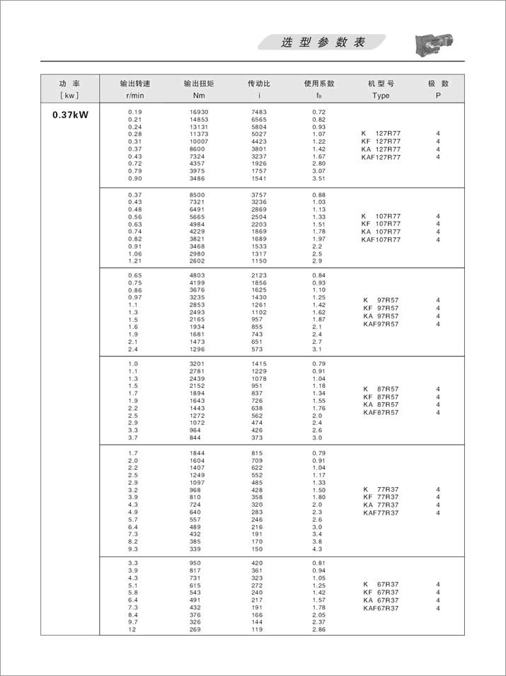 K螺旋錐齒輪減速機選項參數表0.37KW